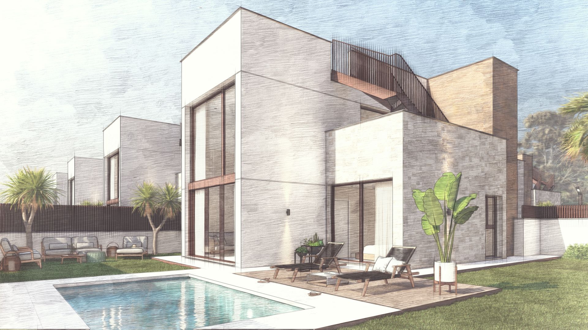 Con una arquitectura que combina armoniosamente revestimientos en piedra y detalles en acero corten, las villas reflejan la perfecta fusión entre la robustez del material y la sofisticación moderna. Destacan sus líneas rectas y limpias, ofreciendo una estética minimalista y elegante.